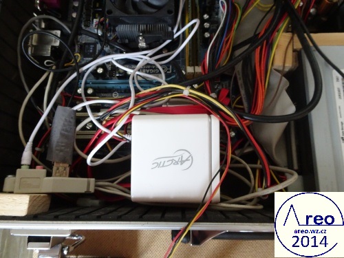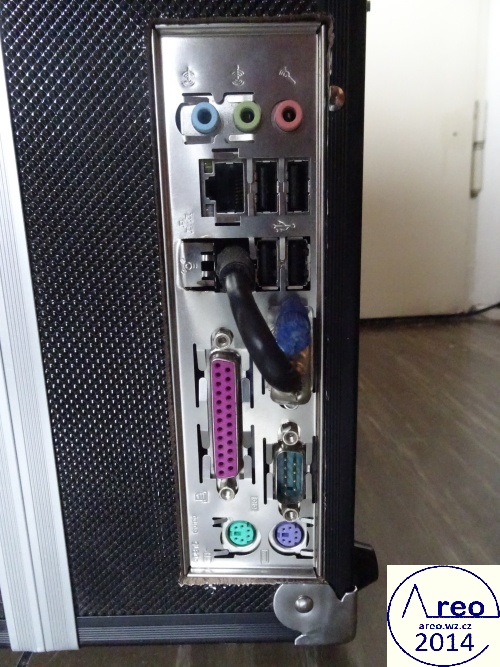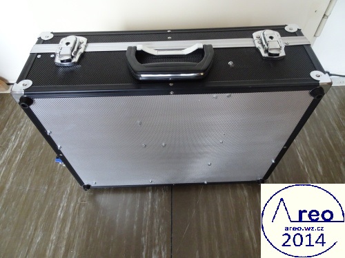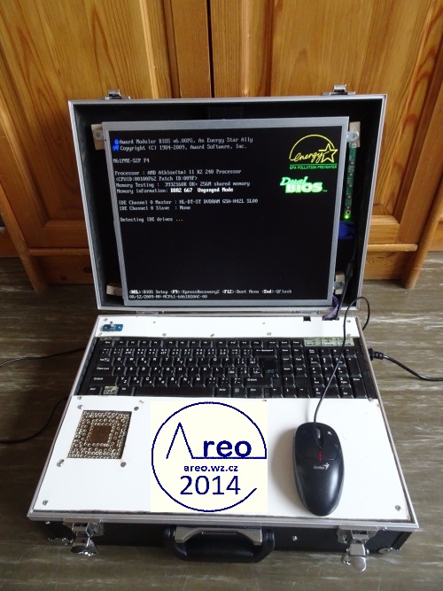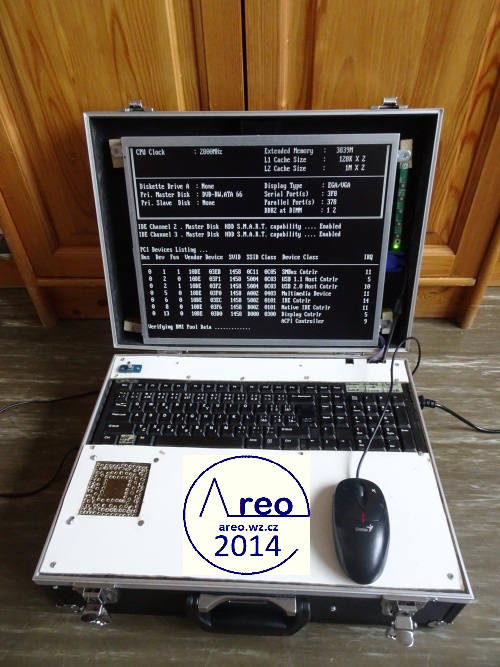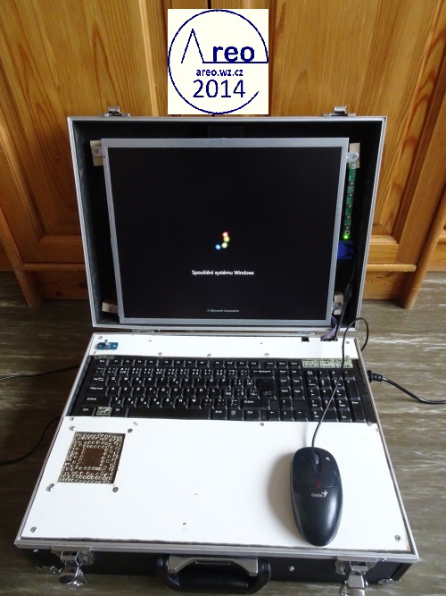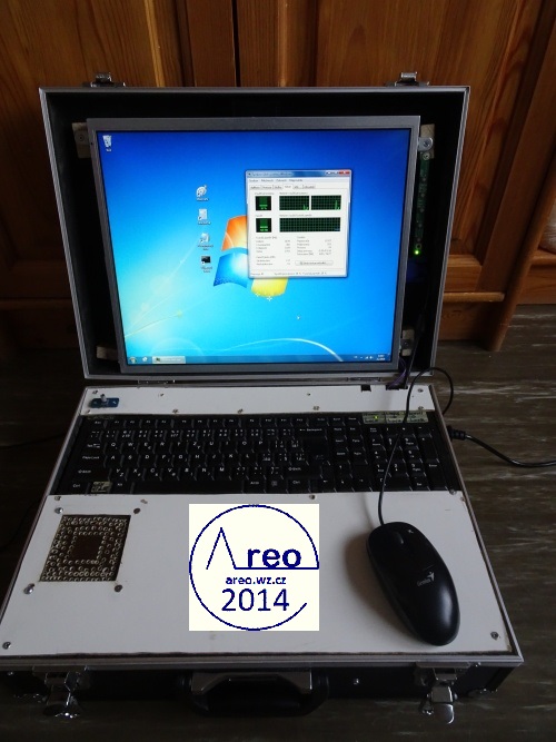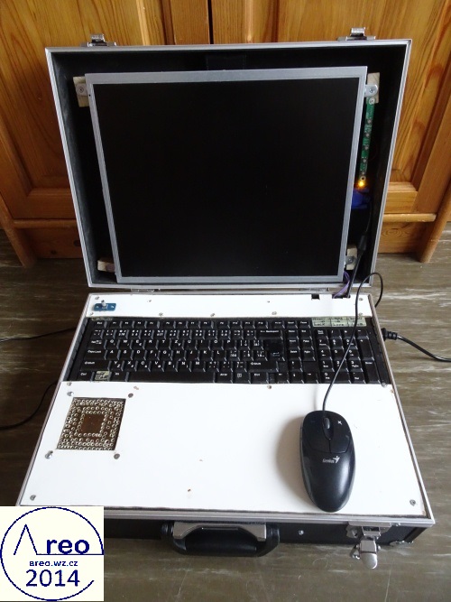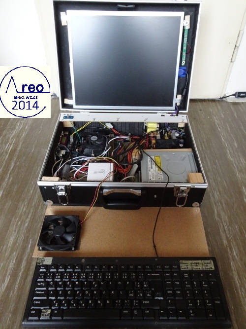 Toto je kufříkový počítač s kufříkem z Bauhausu. Má CD/DVD mechaniku, WiFi, 1x HDD 250GB, 1x SSD 30GB, MONO reproduktor se zesilovačem, monitor, klávesnici, základní desku s 4GB RAM DDR2 a dvoujádrovým procesorem AMD Athlon xII 3GHz a nakonec ATX zdroj. Reproduktory byly původně STEREO, ale byl upraven na MONO spojením vstupních kanálů a odpojením jednoho reproduktoru. FDD mechaniku jsem tam chtěl integrovat, ale poněvadž tam není již moc místa, tak tam nakonec není. Nejdříve se přehříval, ale po nainstalování ventilátoru na svrchní desku je vyřešeno. Samozřejmě ventilátor fouká nahoru z počítače, poněvadž teplý vzduch se drží nahoře, takže je to takto mnohem efektivnější. Všechny ventilátory mají regulovanou rychlost dle teploty. Stavba trvala asi čtyři dny.