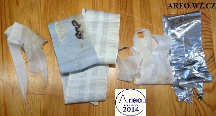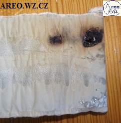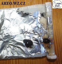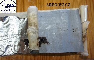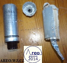 Při opravě TESLA BM 208 jsem musel mimo jiné vyměnit i dva šroubovací kondenzátory 1x8uF 450V a 1x32uF 450V. Měly tvrdý interní zkrat, takže náhrada nutná. Tu jsou obrázky zevnitř jednoho z těch dvou kondenzátorů. Papír byl stále nasáklý elektrolytem. Na konci je jasně vidět místo zkratů.