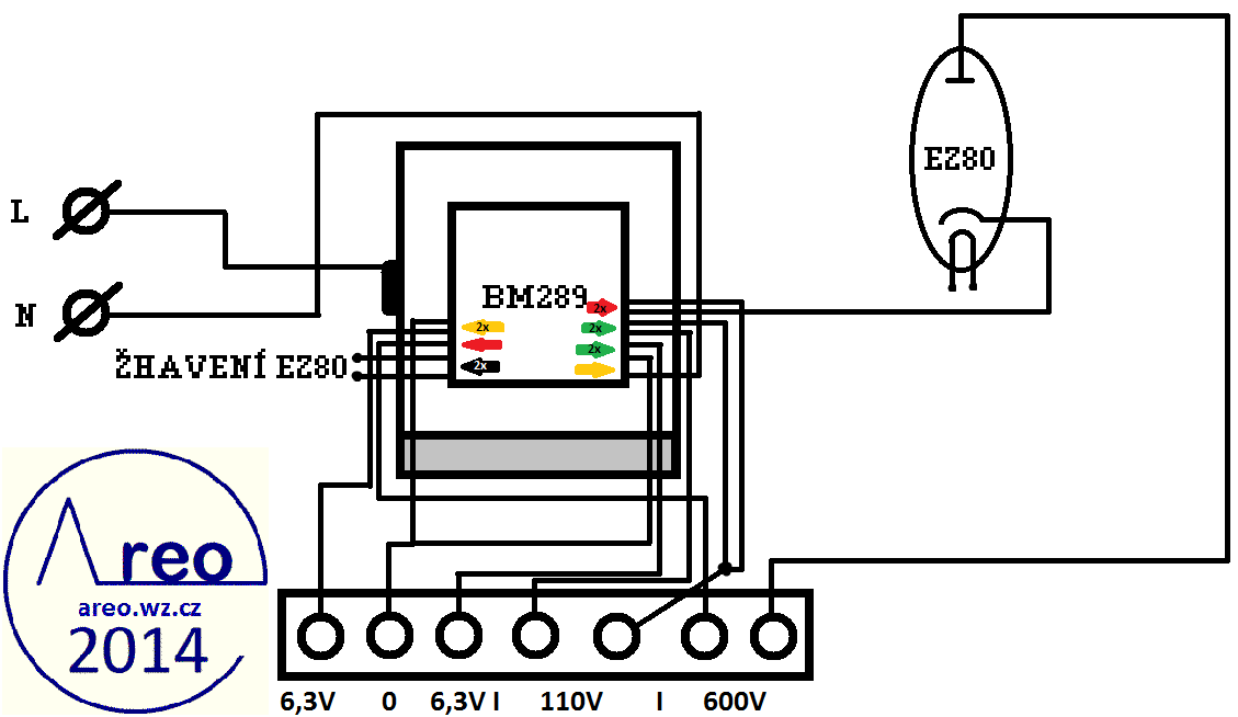 Zdroj založený na transformátoru z měřicího přístroje TESLA BM289. Výstupy: 2x 6,3VAC 1x 115VAC 1x 600VDC se zkratovým proudem 110mA. Elektronka EZ80 není na 600V, tak je dobré tam dát nějakou, které nebude škoda. A nebo ideálně elektronku na to stavěnou. Na výstupu 600VDC mám filtrační kondenzátor 2uF 400V. To je ale špatně, měl by tam být na min. 650V. Na výstup 600V rozsvítí zářivku. Pokud to budete zkoušet bez proudového omezení, tak je vhodné počítat s poškozením zářivky. Mně je to jedno, poněvadž to je vyhozená testovací zářivka.