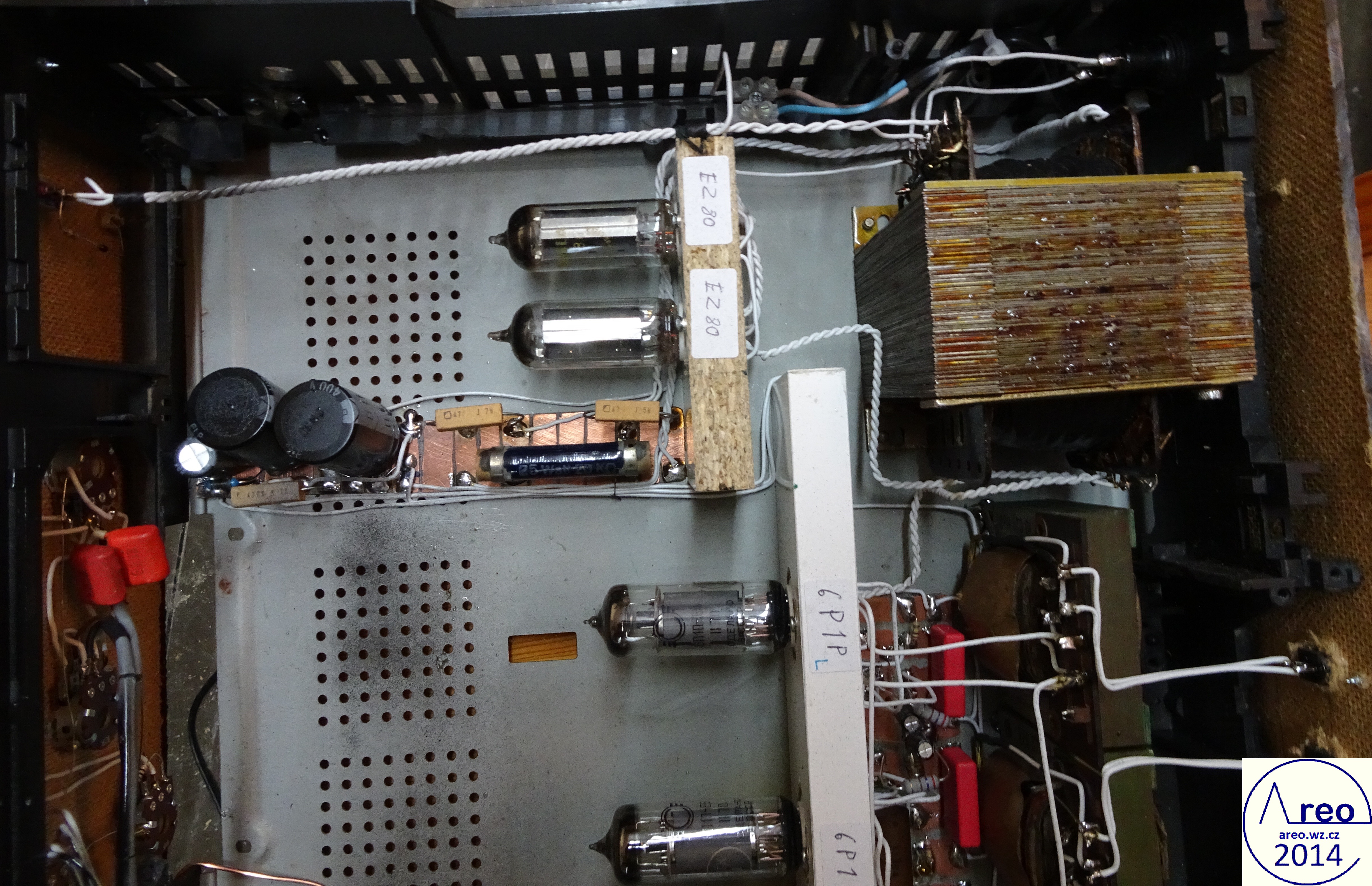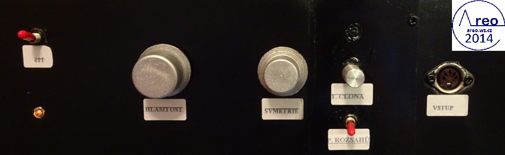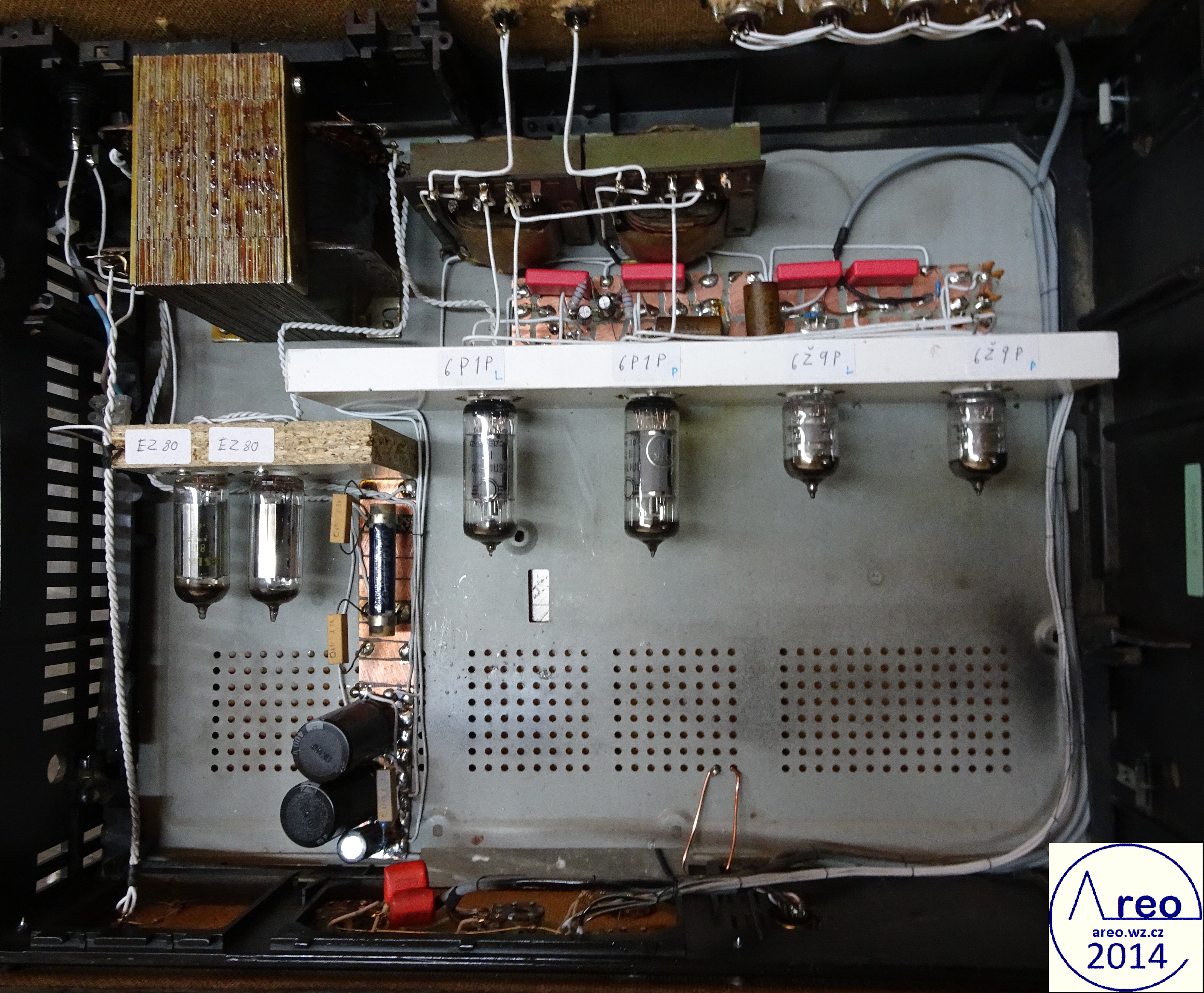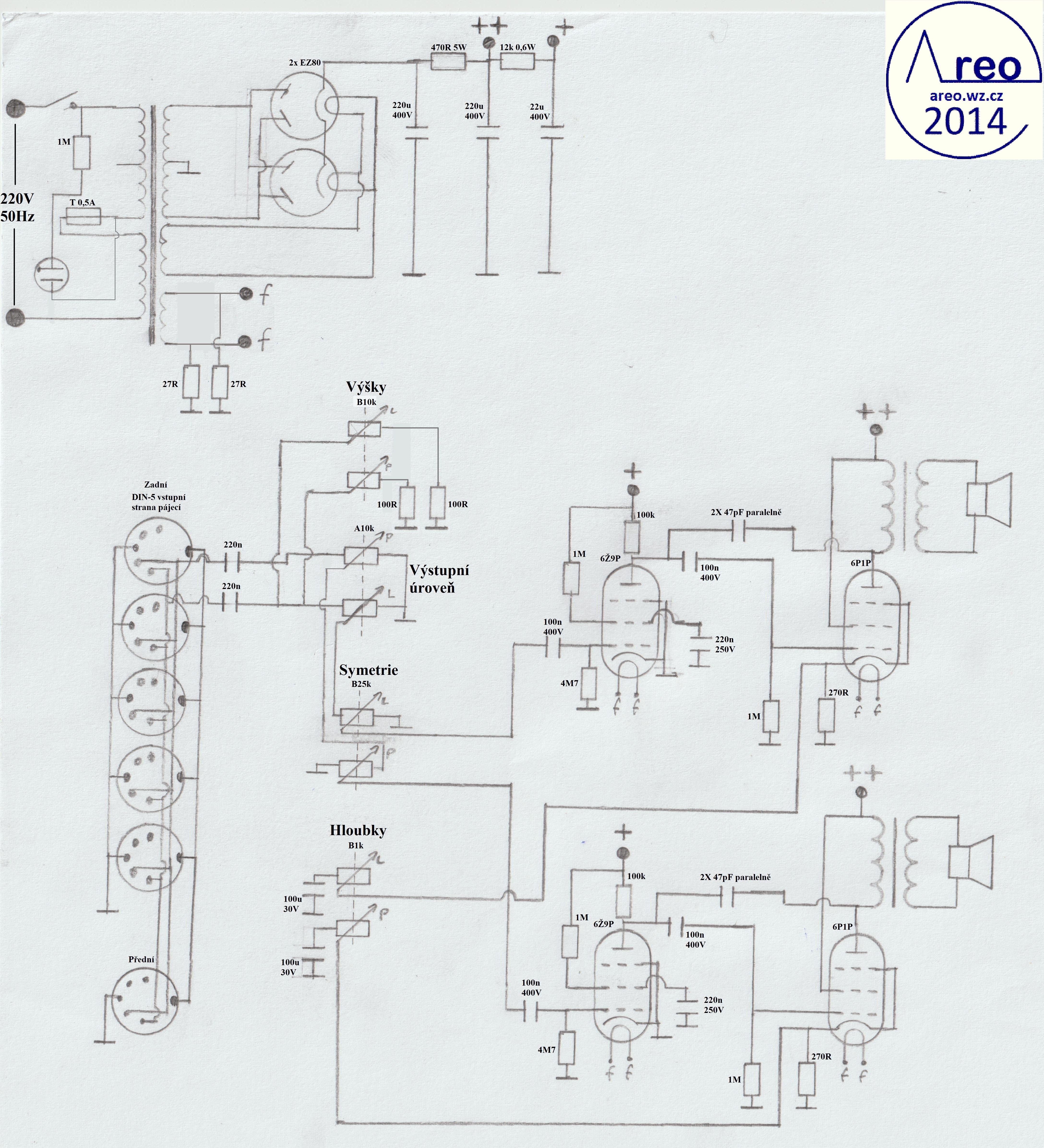 Toto je elektronkový koncový zesilovač s linkovým vstupem. Je to pořádný elektronkový přístroj, ne nějaký hybrid s polovodičovým usměrňovačem :-). Také je postaven do normální HiFi krabice, aby na něj šly dát magnetofony. V zesilovací části jsou použity SSSR elektronky, které se v této době již moc nepoužívají. Elektronky se do něj tedy shánějí mnohem lépe, než do zesilovače s EL84 a podobnými. Výstupní výkon mého kusu je 2x2W, což je na domácí poslech dostatečné. Důvodů zbytečně nízkého výkonu je více, jedním z nich je nízký zisk předzesilovače (nedostatečně velký rozkmit jeho výstupu). Pro nějaké vstupy bylo nutno použít externího předzesilovače. Hlavním problémem však jsou naprosto nevhodné výstupní transformátory, jenž po 600 Hz začnou padat (pravděpodobně určeny na mluvené slovo). S lepšími by to byl mnohem lepší přístroj. Odběr anodového proudu zesilovacích elektronek je přibližně 84mA. Na ++ napájecí větvi je okolo 200V a na + asi 186V. Při konstrukci jako dole na obrázcích nemá vůbec potíže s brumem. Síťový transformátor by měl mít vinutí anodové 700V se střední odbočkou, tedy 2x350V a žhavicí vinutí 2x6,3V. Vhodný síťový transformátor nebyl k dispozici, tak byl použit jeden převinutý z BS 275. Nedopadlo to ideálně. Anodové vinutí jsem trochu převinul, takže má 2x387V a katalogový limit EZ80 je 2x350V. Proto je na obrázcích ještě dělič napětí před usměrňovacími elektronkami. Pěkně to tam topí. Ten dělič je zbytečně neúčinný, šel by udělat mnohem lépe a nemusí to ani být dělič. EZ80 jsou tam dvě paralelně zbytečně, poněvadž při stavbě jsem si někde mylně přečetl, že má maximální proud 45mA. Skutečně nemám tušení, jak se to stalo. Žhavicí vinutí mého transformátoru nezvládá na 6,3V užhavit všechny zesilovcí elektronky a tak je tam okolo 5,4V. Po zkoušce jsem zjistil, že při připojení správného žhavicího napětí se výkon zesilovače nezvýší, ale stejně doporučuji žhavit správným napětím. Přepínání vstupů jsem nepoužil, poněvadž ho nepotřebuji. V případě potřeby není problém ho tam připojit. Potenciometr označený hloubky není třeba používat, místo něj používám přepínač. Tento potenciometr reguluje míru velmi nízkých dunivých frekvencí. Potenciometr Výšek funguje jako celková tónová clona. Zapojení je inspirováno zapojením Danyka a zapojením Sonetu Duo. Stavba trvala asi šest dní i s odladěním nějakých nedostatků.