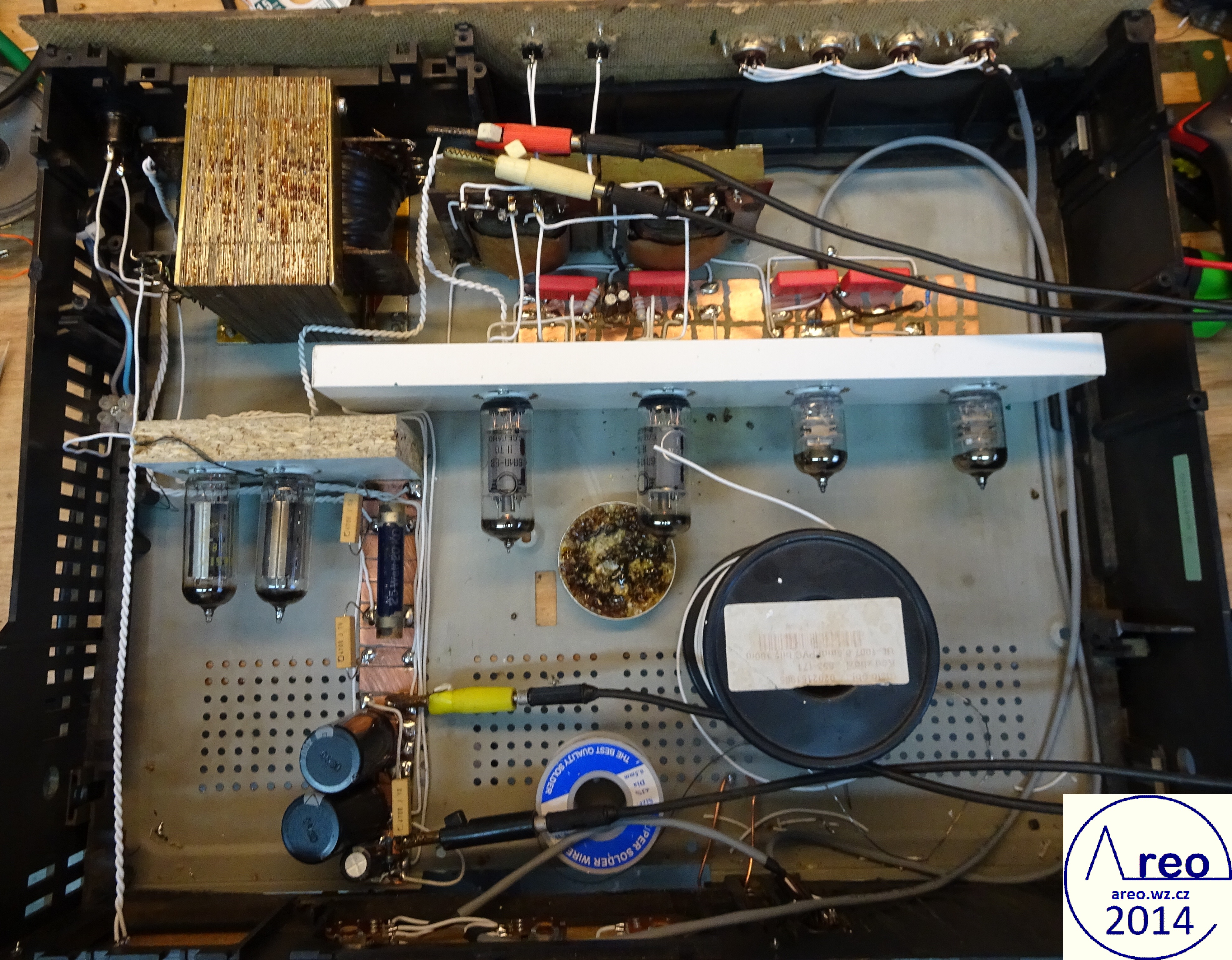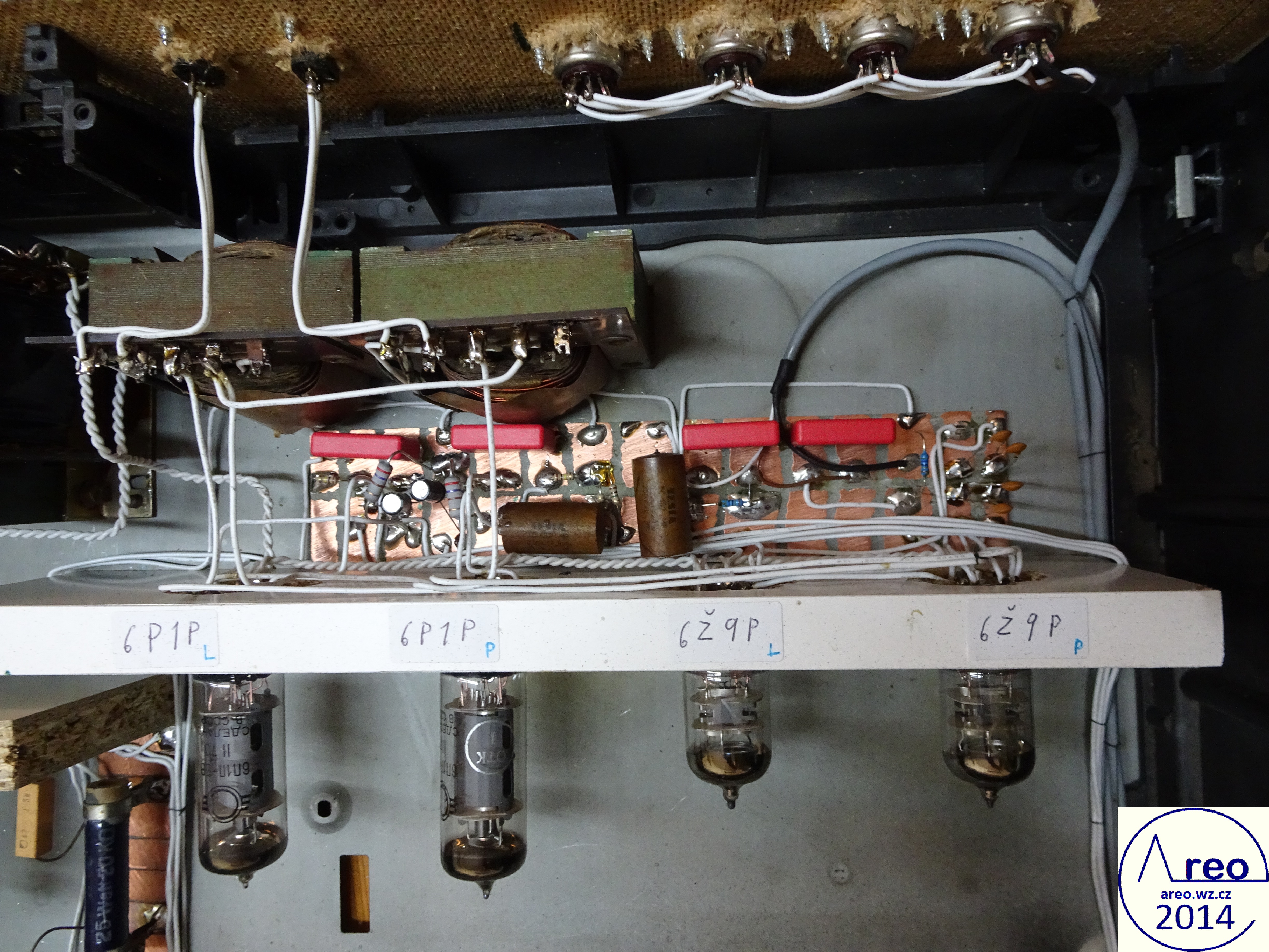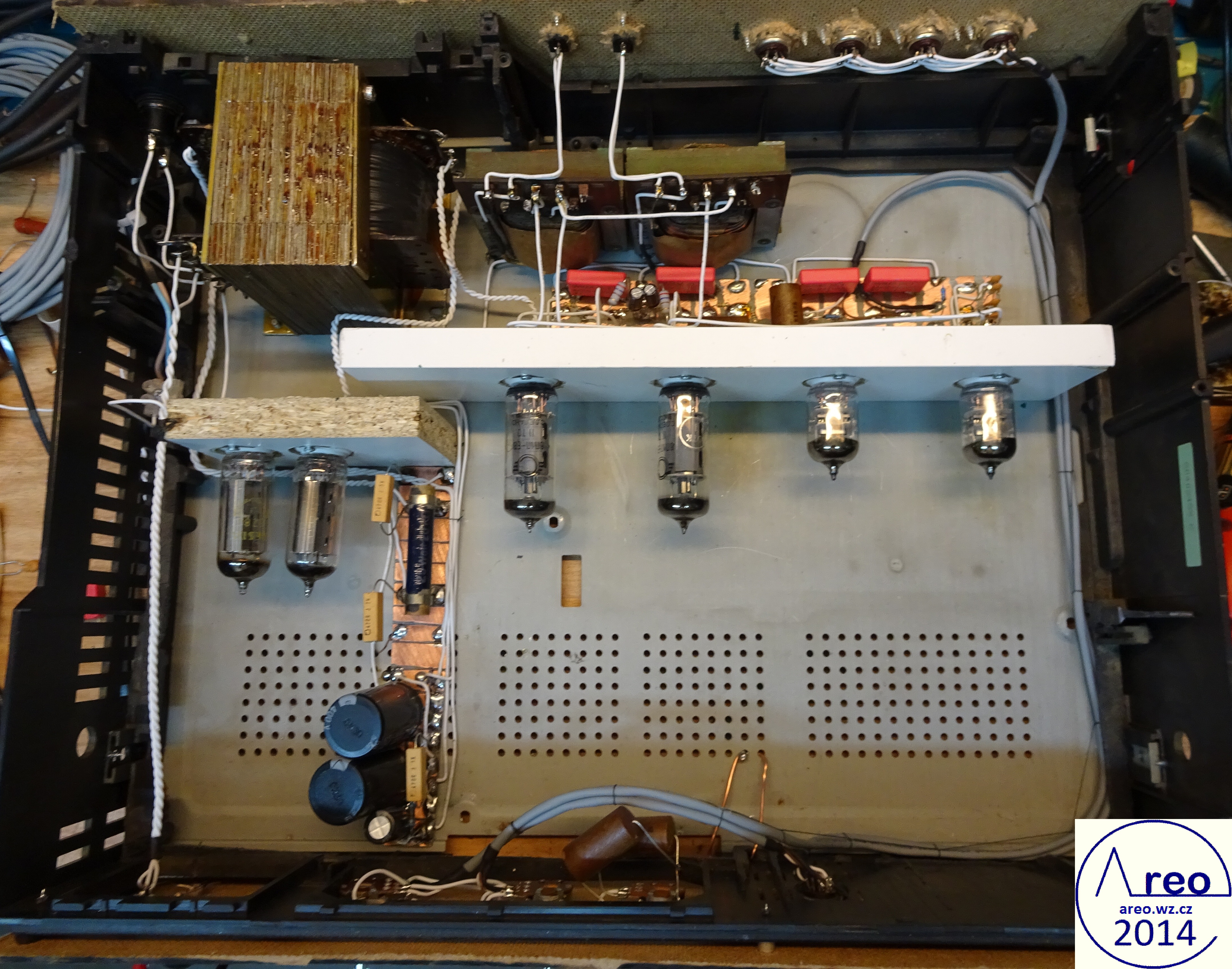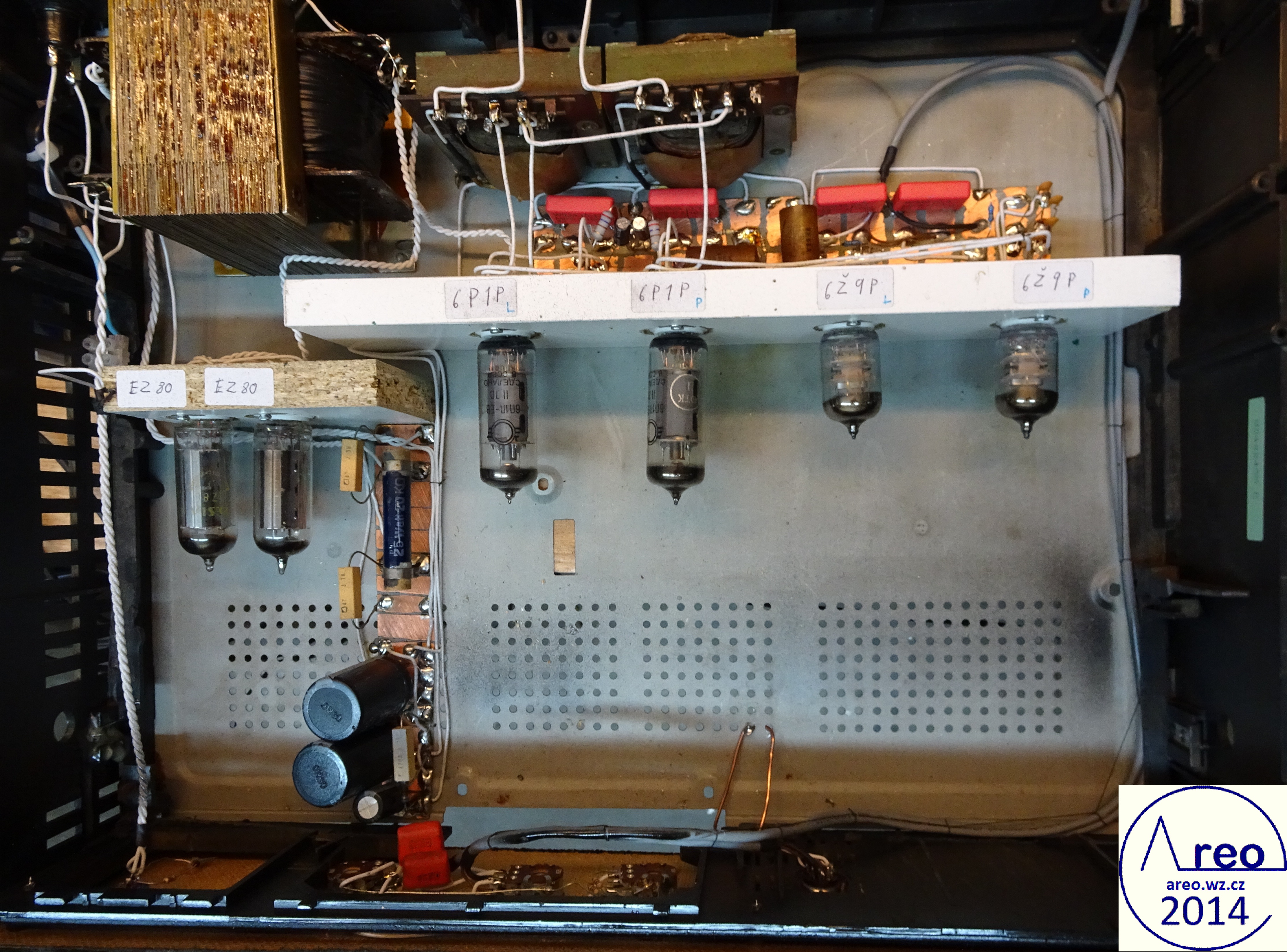 Toto je elektronkový koncový zesilovač s linkovým vstupem. Je to pořádný elektronkový přístroj, ne nějaký hybrid s polovodičovým usměrňovačem :-). Také je postaven do normální HiFi krabice, aby na něj šly dát magnetofony. V zesilovací části jsou použity SSSR elektronky, které se v této době již moc nepoužívají. Elektronky se do něj tedy shánějí mnohem lépe, než do zesilovače s EL84 a podobnými. Výstupní výkon mého kusu je 2x2W, což je na domácí poslech dostatečné. Důvodů zbytečně nízkého výkonu je více, jedním z nich je nízký zisk předzesilovače (nedostatečně velký rozkmit jeho výstupu). Pro nějaké vstupy bylo nutno použít externího předzesilovače. Hlavním problémem však jsou naprosto nevhodné výstupní transformátory, jenž po 600 Hz začnou padat (pravděpodobně určeny na mluvené slovo). S lepšími by to byl mnohem lepší přístroj. Odběr anodového proudu zesilovacích elektronek je přibližně 84mA. Na ++ napájecí větvi je okolo 200V a na + asi 186V. Při konstrukci jako dole na obrázcích nemá vůbec potíže s brumem. Síťový transformátor by měl mít vinutí anodové 700V se střední odbočkou, tedy 2x350V a žhavicí vinutí 2x6,3V. Vhodný síťový transformátor nebyl k dispozici, tak byl použit jeden převinutý z BS 275. Nedopadlo to ideálně. Anodové vinutí jsem trochu převinul, takže má 2x387V a katalogový limit EZ80 je 2x350V. Proto je na obrázcích ještě dělič napětí před usměrňovacími elektronkami. Pěkně to tam topí. Ten dělič je zbytečně neúčinný, šel by udělat mnohem lépe a nemusí to ani být dělič. EZ80 jsou tam dvě paralelně zbytečně, poněvadž při stavbě jsem si někde mylně přečetl, že má maximální proud 45mA. Skutečně nemám tušení, jak se to stalo. Žhavicí vinutí mého transformátoru nezvládá na 6,3V užhavit všechny zesilovcí elektronky a tak je tam okolo 5,4V. Po zkoušce jsem zjistil, že při připojení správného žhavicího napětí se výkon zesilovače nezvýší, ale stejně doporučuji žhavit správným napětím. Přepínání vstupů jsem nepoužil, poněvadž ho nepotřebuji. V případě potřeby není problém ho tam připojit. Potenciometr označený hloubky není třeba používat, místo něj používám přepínač. Tento potenciometr reguluje míru velmi nízkých dunivých frekvencí. Potenciometr Výšek funguje jako celková tónová clona. Zapojení je inspirováno zapojením Danyka a zapojením Sonetu Duo. Stavba trvala asi šest dní i s odladěním nějakých nedostatků.