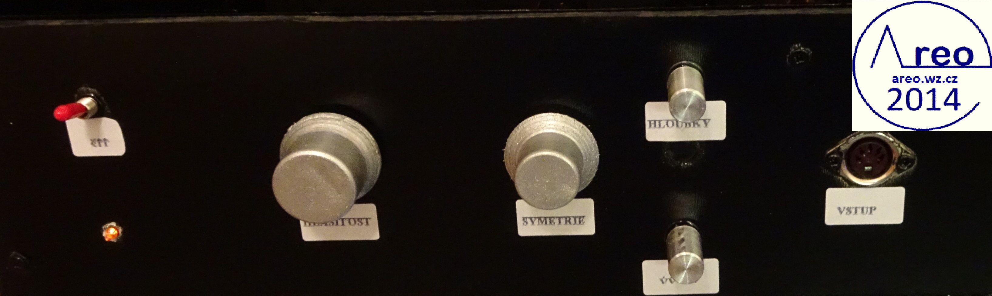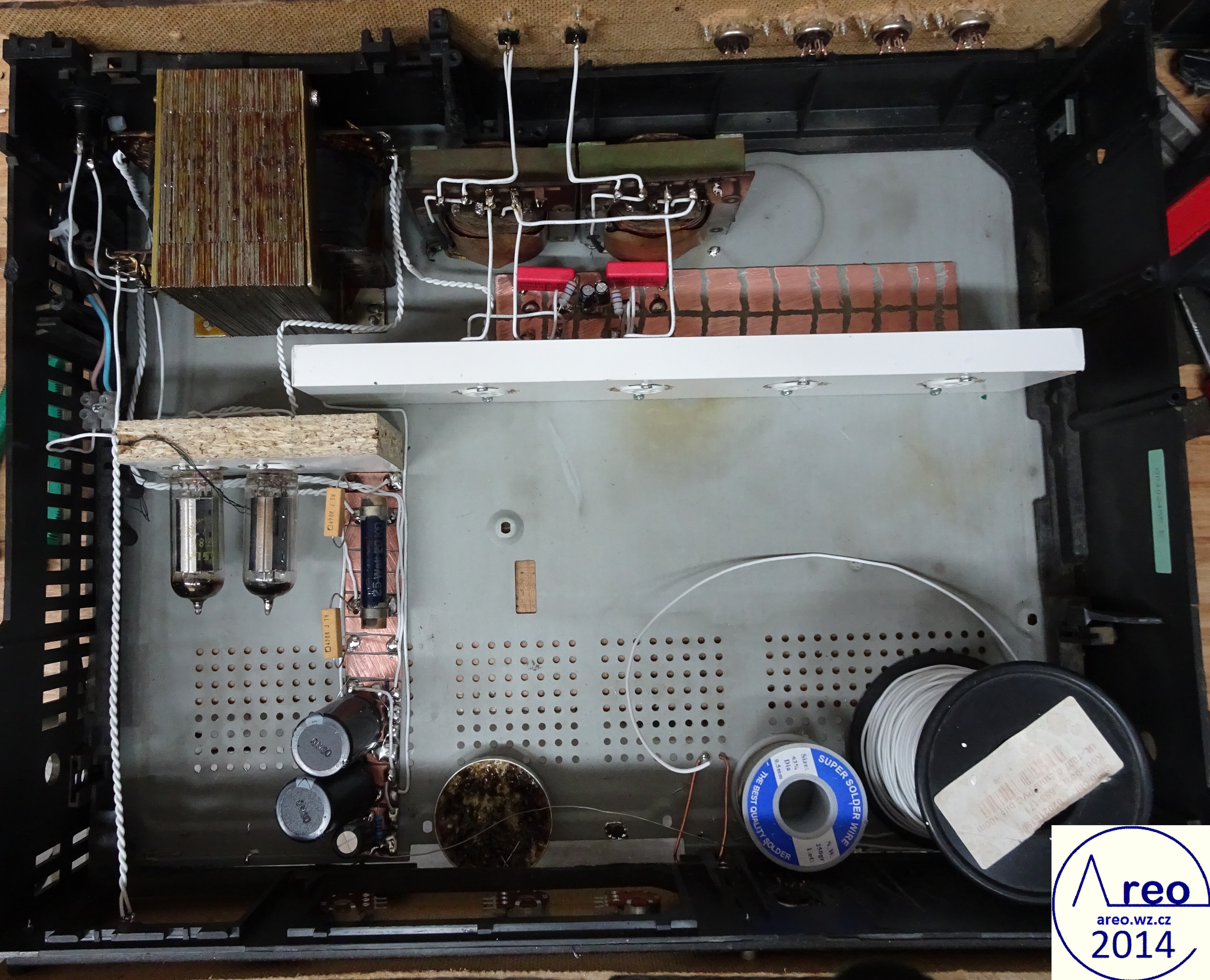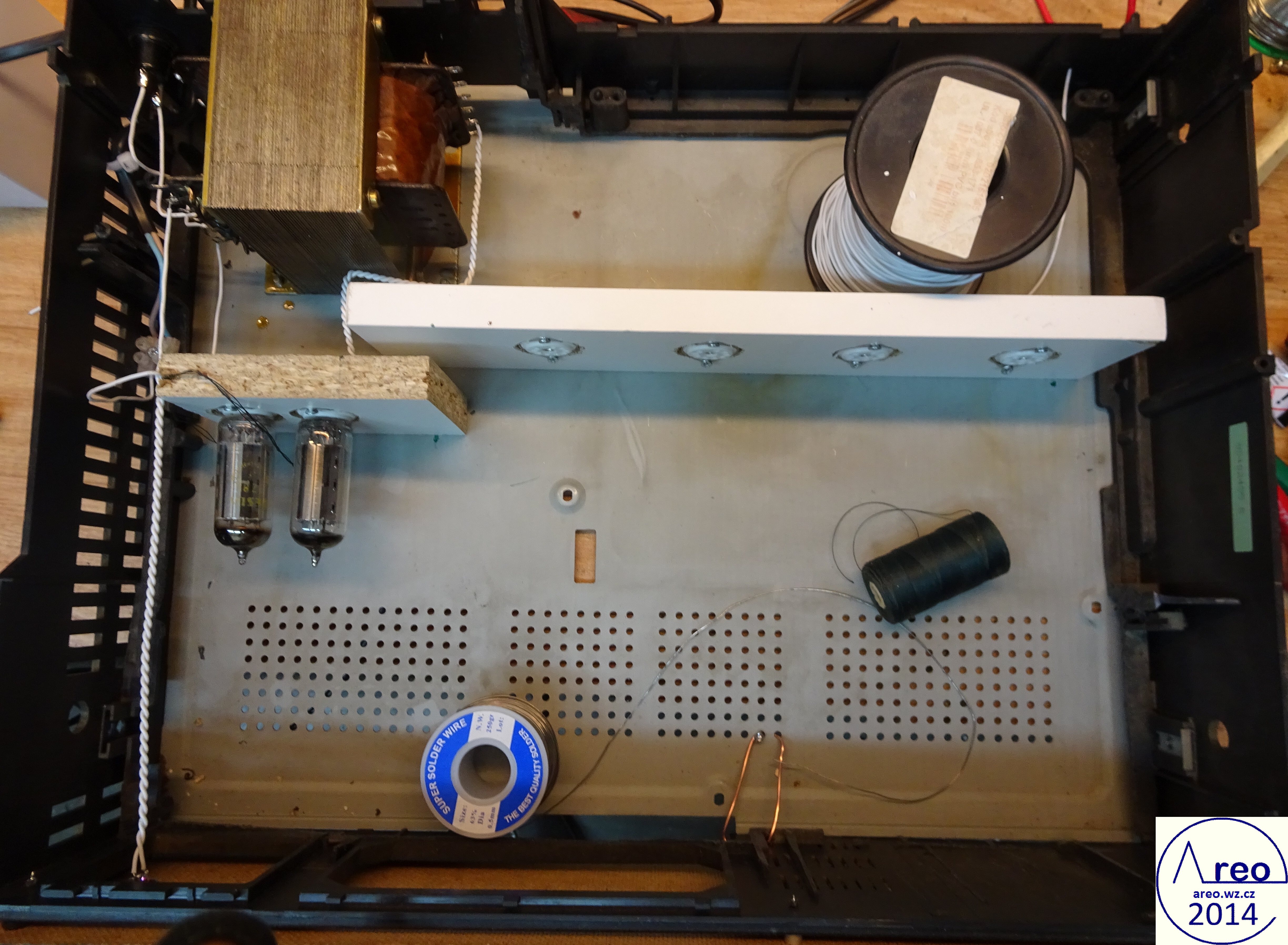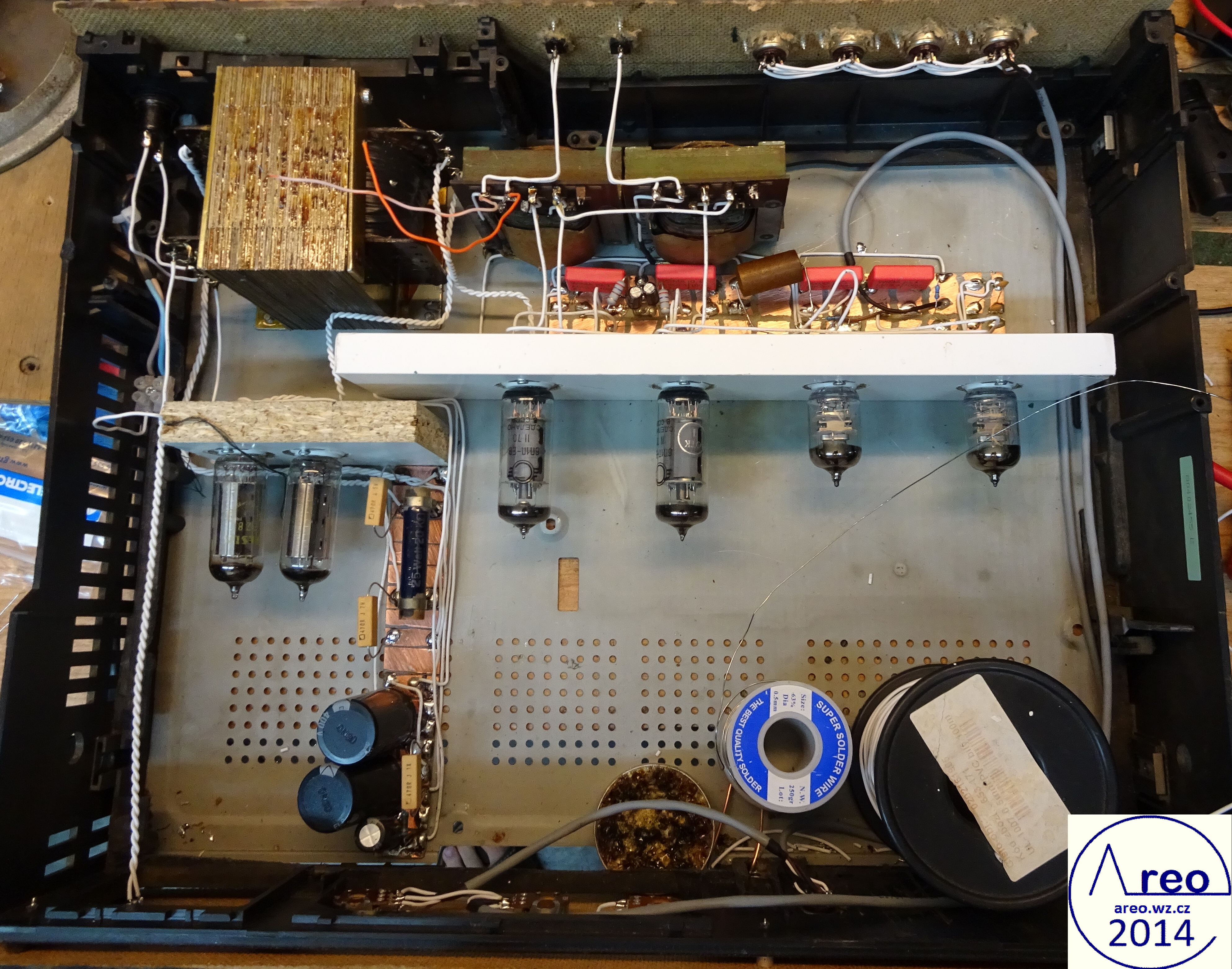Toto je elektronkový koncový zesilovač s linkovým vstupem. Je to pořádný elektronkový přístroj, ne nějaký hybrid s polovodičovým usměrňovačem :-). Také je postaven do normální HiFi krabice, aby na něj šly dát magnetofony. V zesilovací části jsou použity SSSR elektronky, které se v této době již moc nepoužívají. Elektronky se do něj tedy shánějí mnohem lépe, než do zesilovače s EL84 a podobnými. Výstupní výkon mého kusu je 2x2W, což je na domácí poslech dostatečné. Důvodů zbytečně nízkého výkonu je více, jedním z nich je nízký zisk předzesilovače (nedostatečně velký rozkmit jeho výstupu). Pro nějaké vstupy bylo nutno použít externího předzesilovače. Hlavním problémem však jsou naprosto nevhodné výstupní transformátory, jenž po 600 Hz začnou padat (pravděpodobně určeny na mluvené slovo). S lepšími by to byl mnohem lepší přístroj. Odběr anodového proudu zesilovacích elektronek je přibližně 84mA. Na ++ napájecí větvi je okolo 200V a na + asi 186V. Při konstrukci jako dole na obrázcích nemá vůbec potíže s brumem. Síťový transformátor by měl mít vinutí anodové 700V se střední odbočkou, tedy 2x350V a žhavicí vinutí 2x6,3V. Vhodný síťový transformátor nebyl k dispozici, tak byl použit jeden převinutý z BS 275. Nedopadlo to ideálně. Anodové vinutí jsem trochu převinul, takže má 2x387V a katalogový limit EZ80 je 2x350V. Proto je na obrázcích ještě dělič napětí před usměrňovacími elektronkami. Pěkně to tam topí. Ten dělič je zbytečně neúčinný, šel by udělat mnohem lépe a nemusí to ani být dělič. EZ80 jsou tam dvě paralelně zbytečně, poněvadž při stavbě jsem si někde mylně přečetl, že má maximální proud 45mA. Skutečně nemám tušení, jak se to stalo. Žhavicí vinutí mého transformátoru nezvládá na 6,3V užhavit všechny zesilovcí elektronky a tak je tam okolo 5,4V. Po zkoušce jsem zjistil, že při připojení správného žhavicího napětí se výkon zesilovače nezvýší, ale stejně doporučuji žhavit správným napětím. Přepínání vstupů jsem nepoužil, poněvadž ho nepotřebuji. V případě potřeby není problém ho tam připojit. Potenciometr označený hloubky není třeba používat, místo něj používám přepínač. Tento potenciometr reguluje míru velmi nízkých dunivých frekvencí. Potenciometr Výšek funguje jako celková tónová clona. Zapojení je inspirováno zapojením Danyka a zapojením Sonetu Duo. Stavba trvala asi šest dní i s odladěním nějakých nedostatků.