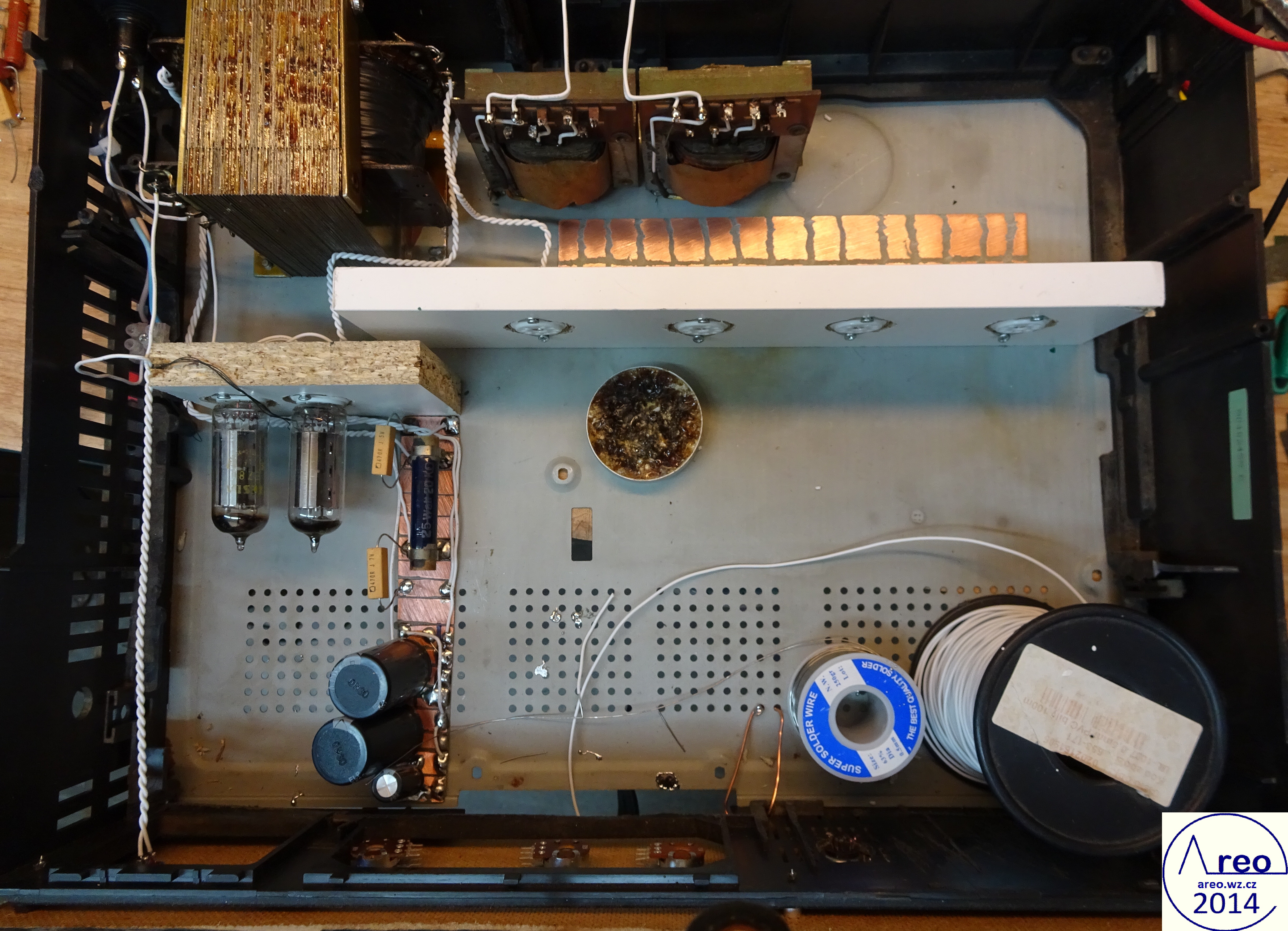 A ještě neodborné poznámky co v obvodu co dělá a praktické poznámky: Kondenzátory 2x47pF mezi anodami- upravují tón zvuku, omezují oscilace, čím větší kapacita, klesá zesílení a zvuk má málo výšek, bez nich zesilovač kmitá, má moc výšek a je náchylnější na pobírání rušivých polí. Kondenzárory 220n - bez nich zesilovač nemá téměř žádné zesílení. Odpory 2x27R na žhavicí větvi pro zesilovací elektronky dramaticky potlačují brum. Spodní plech musí být uzeměný, aby zesilovač nepraskal, vrchní nemusí. Kromě kondenzátorů 2x47pF nikde v zesilovači nejsou použity keramické kondenzátory, poněvadž ve vysokoimpedančních obvodech občas mohou způsobiti potíže. Na začátku vývoje se mi stalo, že se zesilovač tak rozkmital, že spolu s výstupními transformátory naindukoval vysoké napětí a na paticích výkonových elektronek se natáhly výboje.