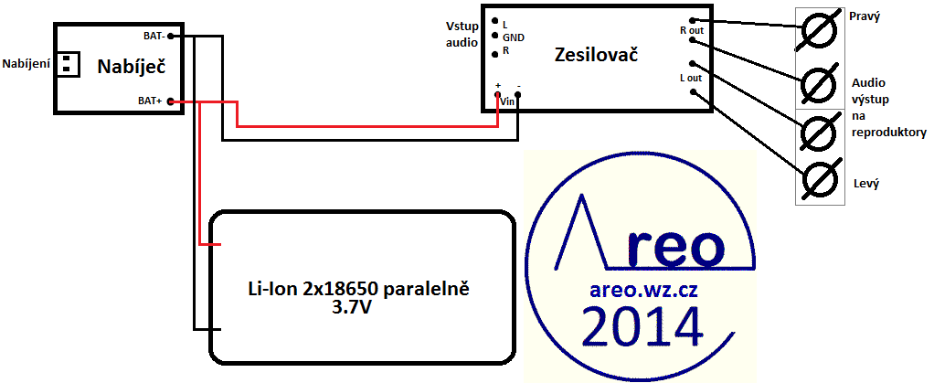 Toto je bateriový stereo zesilovač sestavený z hotových modulů. Objednávací čísla modulů v obchodu GM: Zesilovač=772-322, Nabíjecí modul=775-103 a ostatní jsou běžně sehnatelné.